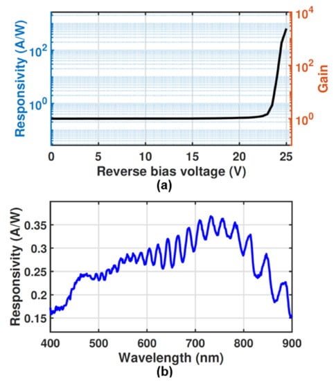 The spectral distribution of the unamplified responsivity (M = 1) is shown in Figure 10b. A monochromator (Digikrom CM110) is used to sweep the wavelength from 400 nm to 900 nm by steps of 1 nm. The light source is calibrated to provide a constant optical power of 2 nW over the spectrum using an optical power meter and a coupled variable optical attenuator. It can be seen that at = 675 nm and op = 2 nW, the responsivity of 0.27 A/W is achieved, which is as expected since the unamplified responsivity is independent of the optical power [].