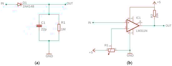 Electronic circuit diagram: (a) Peak detector; (b) Voltage comparator.