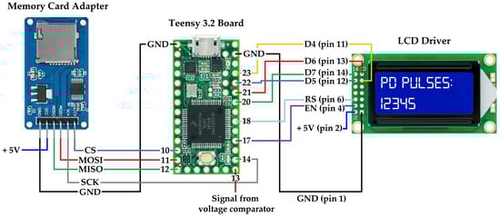 The output signal from the voltage comparator is fed directly to Pin 13 of the microcontroller. If the amplitude of the signal at the input of the comparator is higher than the set trigger level, then its output returns a logic “high” state (~3.3 V). Otherwise, a logic “low” state (~0 V) is sent to Pin 13. The microcontroller continuously counts the PD pulses and records their current number every minute on the microSD memory card (Open Smart Technologies Limited, Hong Kong, China) and displays it on the 8 × 2 character monochrome LCD display type WC0802C (Hubbell Wiegmann, Freeburg, IL, USA). The schematic diagram of connecting the LCD driver and the microSD card adapter to the Teensy 3.2 board is shown in Figure 6.