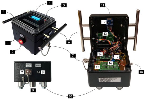 Photo of the system assembly: 1—aluminum electronic enclosure, 2—power switch, 3—polycarbonate inspection window, 4—LCD display, 5—reset switch, 6—handles, 7—BNC connector (bandpass filter output) for optional AE signal transmission, 8—DC power connector, 9—piezoelectric transducer, 10—magnetic holders, 11—micro SD card slot, 12—memory card adapter, 13—LCD driver board, 14—Teensy 3.2 development board, 15—amplifier board, 16—bandpass filter board, 17—peak detector and voltage comparator board, 18—grounding screw.