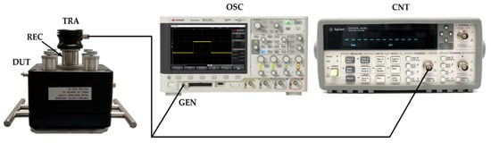 Schematic diagram of the measurement system for testing the efficiency of counting AE pulses by the monitoring system: TRA—wideband piezoelectric transducer Olympus V101B for generating AE pulses (transmitter), REC—piezoelectric transducer of the monitoring system (receiver), DUT—monitoring system (device under test), OSC—oscilloscope Keysight DSOX2024A, GEN—signal generator, CNT—universal counter Agilent/HP 53132A.