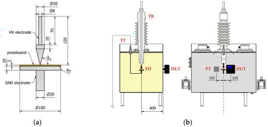 Test of the monitoring system in laboratory conditions: (a) electrode system for generating surface discharges; (b) arrangement of the tested and reference monitoring system on the transformer tank model: TT—oil filled transformer tank with electrode system for generating partial discharges; TB—transformer bushing; PD—electrode system for generating surface partial discharges PT—piezoelectric transducer A6890; DUT—system under test.