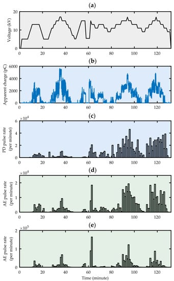 Test voltage value (a), PD apparent charge (b), number of PD pulses recorded by a conventional partial discharge meter PD-Smart, (c) number of AE pulses recorded by the reference monitoring system PDtracker Portable, (d) number of AE pulses registered by the tested, low-cost PD monitoring system (e).