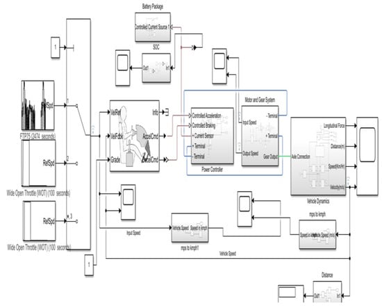 The experimental purpose and futuristic insight of the ADAS for an electric vehicle are completed based on the various user-defined physical inputs using software such as Simulink in MATLAB []. The proposed methodology is based on the various inputs in the cloud infrastructure from which the behavior of electric vehicles for different drive cycles [] in series, parallel and hybrid configurations [] are analyzed continuously. The need for such prototyping is to optimize the powertrain requirements for different modes such as route-based drive, online drive, and integrated drive with path planning [] and for driving mode selection [] with the aid of ML algorithms for an economic drive []. To achieve this, in this work the process is analyzed with several critical parameters such as vehicle dynamics, motor and battery selection, speed, range, capacity, and weight estimations [], and the impacts of different speed regions with critical parameter considerations [] over the vehicle performance.