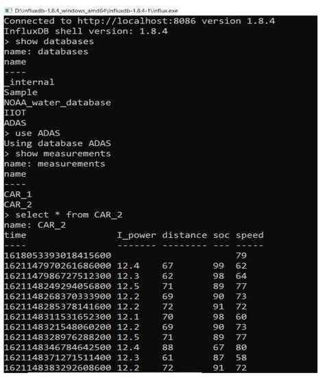 For the proposed design, the Influx DB is the preferred local server that manages the sensor data collected through the V2I protocol. The console is a command-based query where the query is defined to create and manage the database. In similar ways, multiple tables are created for multiple end nodes in which the cars’ data are sent through the Influx DB. In this process, end node data are managed separately, through which the management of vehicle parameters is achieved. The Influx DB will be able to manage small to the massive amount of data that is required for cloud analytics and visualization in the design developed. Figure 5 represents the collected data of CAR 2 in the DB server for the process. The required data managed in the local server are exhibited as an image from the DB server.