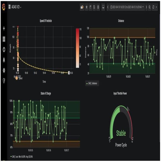 In the proposed work, the collected information is stored in a local server and also in a cloud server. Grafana is used for the analytics and visualization of information with the help of this leads to future prediction. To achieve this, we use technologies such as computer vision, communication mechanisms such as V2V and V2I with the Internet of Things, and cloud analytics features with our ADAS [,]. Here, the role of computer vision is for providing lane change detection and collision avoidance as discussed before, whereas the V2V (vehicle-to-vehicle) technology is aided by this vision-based system to communicate the lane change and proximity alert between vehicles within a stipulated range []. Usage of this V2V communication improves the speed of communication with a high proneness to interference and other constraints. V2I (vehicle-to-infrastructure) technology is used to transmit the vehicular data and the data communicated in V2V to a hub which is a server in our application where the analytics on these data are performed []. Through V2I, individual vehicle data could be stored in a unique channel which is used for future analytics and driving mode formulation. The analytics mentioned are completed using a few cloud platforms where we could visualize and analyze the vehicle data collected which supports the formulation of the custom driving mode and also the level of smoothness in drive []. This data analytics and formulation along with vision-enabled safety system design is the proposed idea of the work which yields a better safety and reliant ADAS for modern automotive.