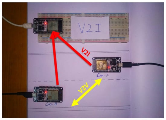 The hardware setup analysis is also completed with the computer vision analysis for the entire unit and is represented in Figure 7. In this hardware, the required analysis of V2I to V2V is completed accordingly. In this simulation, the ESP32 SoC controller is being considered as an electronic control unit (ECU) for other cars for wireless data sharing. For the gateway node (infrastructure) another ESP32 is used for the segregation of vehicle real-time data.