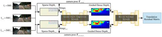 Depth completion methods are mainly divided into two types. One is the supervised methods that rely on the depth value for training [3,4,5,6], and the other is the unsupervised methods that are based on the principle of structure from motion (SFM) [7,8,9]. The supervised depth completion methods minimize the difference between the true depth and the predicted depth during training. Although these methods can guarantee the accuracy of training to the greatest extent, it needs to mark training samples pixel by pixel and frame by frame. This work requires a lot of manpower, and it is often very difficult to obtain the true depth. The unsupervised depth completion method avoids the complex work of marking training samples, but it is always challenged by SFM, such as dynamic objects and occlusion. In order to overcome these challenges, most scholars add additional supervision information such as optical flow and semantics, which make network parameters more complex [10,11]. In this paper, only monocular sequences and IMU (inertial measurement unit) data are used for supervision to realize deep completion and dynamic object motion joint unsupervised learning.