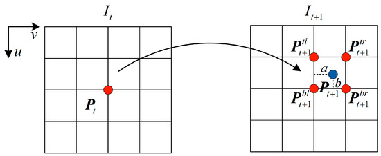 Meanwhile, as shown in Figure 3, in the process of projection reconstruction between two frames, the pixel value of each pixel point of the reconstructed images can be obtained through the differentiable bilinear interpolation method [25]:
