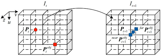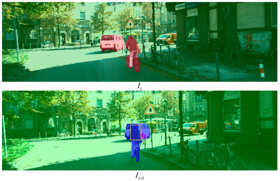 According to Equation (2), the pixel coordinate of the next frame image of the dynamic objects and the pixel value of the corresponding RGB images can be obtained. Note that the key point at this time is to determine whether the pixel belongs to the dynamic object or the static scene. According to Equation (4), the pixel coordinate can be projected back to the pixel coordinate of the current frame, and the corresponding pixel value can be obtained from the RGB images.