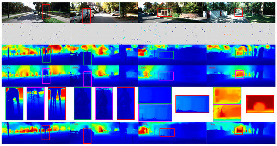 Qualitative results on the KITTI test set. Head-to-head comparison against [9,32]. Our method performs better in the regions with depth-mixing of small structures and the regions with obvious photometric changes in the distance. Note that the sparse depth images are enlarged for visualization and only the areas highlighted in red are shown. In line 5, the green boxes are partially enlarged images of the KBNet results, the pink boxes are partially enlarged images of the MDPC results, and the right red boxes are partially enlarged images of the results of our method.