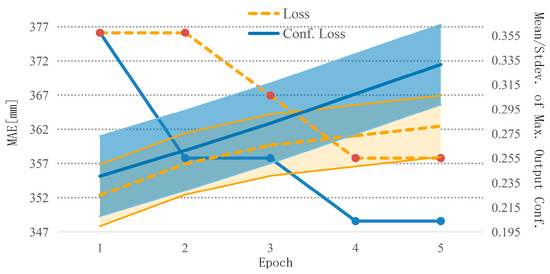 In order to study the role of confidence terms in guiding the training of the depth completion network, that is, the influence of confidence terms on the proposed loss function (Equation (10)), we trained our network twice. The loss function with confidence terms was used the first time (Equation (10)), and the loss function without confidence terms was used the second time (Equation (9)). Figure 8 shows the mean and standard deviation of the maximum output confidence of the images in the KITTI dataset on the right axis and the MAE error on the left axis. A monotonically increasing confidence map was generated through our loss-training network, while improving the depth completion error until convergence. On the other hand, if the network was not trained with confidence guidance, it had a lower output confidence level and converged to a higher MAE.