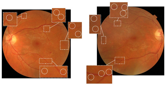 Examples of fundus images of the left and right eye with several microaneurysms.