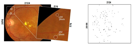 Custom datasets consisting of color fundus images were used in this study. The datasets were created during the execution of international EEA and Norway program project PerDiRe, involving health institutions from Lithuania, Latvia, Estonia and Norway. Several different image-capturing medical devices were used in the study. In general, the medical device Zeiss Visucam 500 was used to capture color fundus images with a resolution of 2124 × 2056 pixels. The dataset consisted of 300 color fundus images (Figure 2 left), from manually segmented images (ground truth annotations), where black blobs indicate the appearance of MAs (Figure 2 right). Ground through images (annotated images) were prepared by a group of ophthalmologists originating from 4 different countries. Each fundus image was carefully inspected and annotated by specialists with more than 5 years of experience. Ground truth segmentation maps had the same size as the original color fundus images. The diameter of the circular area of an MA does not usually exceed more than 50 pixels. Such an area is more than 4000 times smaller than the entire image.