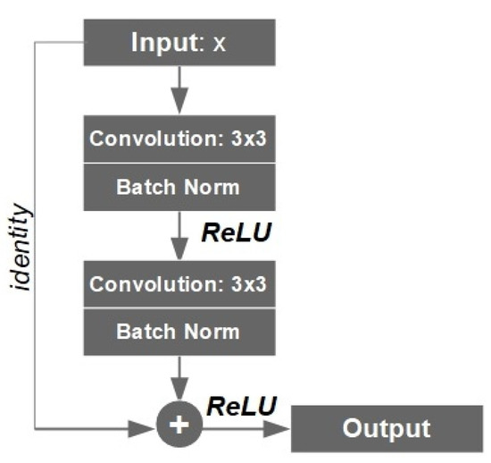 ResNet is a convolutional neural network (CNN) architecture that consist of residual blocks (ResBlocks) with skip connections, and these blocks are connected in series. Each residual block has two connections from the input. The first input goes through a series of convolutional layers, batch normalization and linear functions. The second input skips over that series of convolutions and functions. The tensor outputs of both connections were added up together, as shown in Figure 6. The experiments have shown that the usage of more layers in a neural network can make it more robust for image variation, at the cost of reduced accuracy. To maintain the accuracy and robustness (or to solve the so-called vanishing gradient problem), residual networks become useful when the complexity of the neural network structure is increasing.