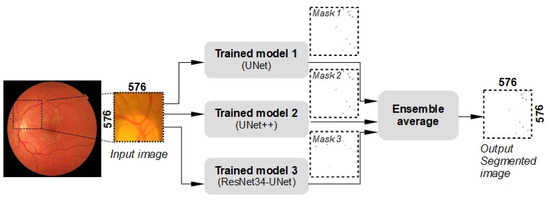 The presented segmentation models have their limits of accurate segmentation when applied on different eye fundus images. These limitations can appear when the eye fundus is not evenly illuminated, has a different image noise that can occlude important image features or the fundus image is acquired using a different image sensor. Each segmentation model produces different segmentation results, which are almost accurate. All models trained on the same dataset are joined into one ensemble to obtain a higher accuracy and more stable results. The functional diagram of the proposed ensemble is shown in Figure 8. The ensemble combines the three previously introduced models, i.e., UNet, UNet++ and ResNet34-UNet models.