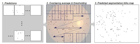 The reconstruction flow of whole segmentation map from individual RoIs is presented in Figure 9. The reconstruction of prediction map consists of three main steps. All individual RoIs are segmented and predictions are acquired using one of proposed segmentation model in the first step. Each predicted RoI is placed on the canvas in the same way they were cropped before and average prediction value from RoIs is calculated. The predictions of the overlapping area are added together and divided by the overlapping number in the second step. Finally, the predicted MAs segmentation map is calculated using a threshold value. The pixels for which predictions were higher than 0.5 were marked with black color; in all other cases, the pixels were marked as white pixels.