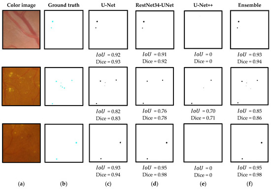 Visualization of the microaneurysm (MA) segmentation results of RoIs acquired from color fundus images: (a) original RoI, (b) the corresponding ground truth annotation, (c) MA segmentation results using the U-Net model, (d) MA segmentation results using the residual U-Net model, (e) MA segmentation results using the U-Net++ model and (f) MA segmentation results using the ensemble of models.