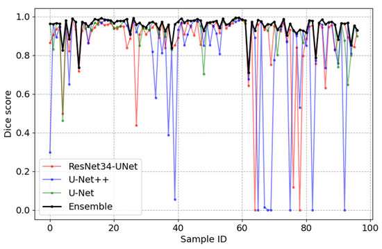 The relationship graph between Dice scores and the tested image is shown in Figure 12, where Dice scores are given on the vertical axis and image ID is given on the horizontal axis. One hundred randomly selected testing images were used to create this graph. The red curve represents the performance of the ResNet-UNet network, the blue curve represents the performance of the U-Net++ network, the green curve is acquired using the U-Net network and the black curve represents the results acquired using the ensemble-based model. On average, the ensemble-based model has a Dice score equal to 0.95. This result is again best when compared to other networks (Table 1). The Dice score of the ensemble-based model drops drastically when all three models fail to accurately detect an MA.