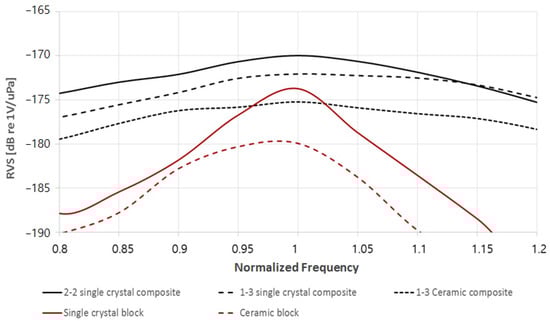 The simulated receiving voltage sensitivity of piezoelectric plates: 2-2 single crystal composite (black solid line), 1-3 single crystal composite (black dashed line), 1-3 ceramic composite (black dotted line), single crystal block (red solid line), and PZT ceramic with single phase (red dashed line).