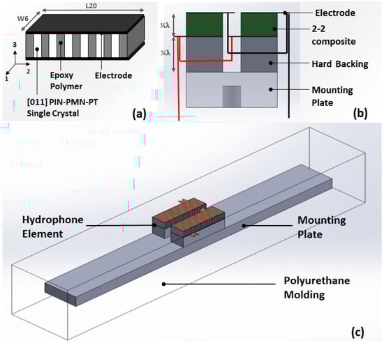 Figure 3 shows a schematic design of the hydrophone. The 2-2 composite is a lamellar stack of the single crystal layers and the polymer layers, as shown in Figure 3a. The PIN-PMN-PT crystal poled in [011] crystal direction and Epotek 301 epoxy are used for active material and polymer material, respectively. The length and width of the composite are 20 mm and 6 mm, respectively. The lateral dimensions were determined to have the required element acoustic beam without lateral vibration modes at the operating frequency. The thickness of the composite is 2.75 mm, which was adjusted using FEM analysis to have a quarter-wavelength resonance at 220 kHz. The volume fraction of the active material in the composite is 0.35 and the kerf size (the width of the polymer layer) is 500 μm. The electrode plates are attached on the top and bottom surface of the composite.