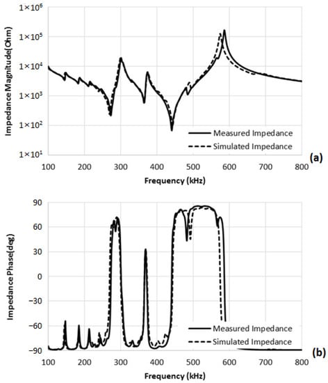 Measured (solid line) and simulated (dashed line) impedance of the 2-2 composite: (a) Impedance magnitude. (b) Impedance phase.