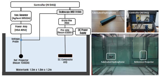 The fabricated hydrophone was tested to validate its acoustic characteristics. The open circuit voltage sensitivity and beam patterns were measured in water-tank facilities. Figure 6 shows the experimental set-up for the hydrophone. The experiments were performed in a 1.5 × 1.8 × 1.2 m water tank with motorized linear and rotation stages. The calibrated reference projector (TC4034) was used to measure the receiving voltage sensitivity of the hydrophone. The hydrophone and the reference projector were installed at the same depth of 0.5 m, with a distance of 1 m in the water tank. An input signal generated from a function generator (Agilent 33522A) was amplified through a power amplifier (HSA 4052) and fed into the reference projector to radiate sound. The measured acoustic signal from the hydrophone was pre-amplified, band-pass filtered (Krohn Hite 3944), and visualized on a digital oscilloscope and a controller (NI PCIe-8861). The voltage levels generated from the hydrophone were measured from the NI controller while changing frequencies from 120 kHz to 280 kHz in step of 5 kHz. The voltage sensitivity of the hydrophone with frequency was calculated by using the calibrated transmitting voltage response of the projector
