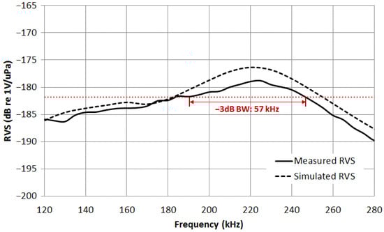 Figure 7 shows the measured and the simulated open circuit voltage sensitivity curves of the hydrophone. The simulated sensitivity curve was calculated from the finite element model of the hydrophone. The maximum voltage sensitivity was −178.5 dB at the thickness-mode resonance frequency of 224 kHz, which is close to the designed frequency. The measured maximum voltage sensitivity at about 3 dB lower than the simulated one. We suspect that the fabrication conditions of the sensor may not be perfect enough. The imperfect adhesion between the composite plate and the hard backing plate may reduce the measured level of sensitivity. The −3 dB bandwidth of the hydrophone was measured to be 57 kHz, with the fractional bandwidth of 25.4%. The bandwidth is inversely proportional to the temporal resolution: resolution = sound velocity/(2 × bandwidth) [34]. The across-track resolution of state-of-the-art high frequency sonar is on the order of a few centimeters, which requires a bandwidth over 30 kHz [4,6]. The proposed hydrophone shows the more than equal bandwidth compared to the sensors in the current developing imaging sonar field.