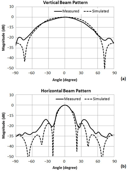 Figure 8 shows the measured and simulated beam patterns of the hydrophone near the resonance frequency. The simulated beam patterns were calculated from the finite element model of the hydrophone. The vertical and horizontal beam patterns were measured using a rotating hydrophone in the water tank. The measured beam patterns were well matched to the simulated beam patterns in their major lobes. The measured and simulated beam patterns showed differences in their minor lobes. The measured voltage level was too low in their minor lobes, including null points, to achieve precise measured data. The −3 dB beam width of the vertical beam pattern and the horizontal beam pattern were 48° and 19.5°, respectively. The hydrophone element was designed to have relatively wide vertical beam width to ensure sufficient vertical coverage of the sonar. The horizontal beam was designed to be sharp enough to suppress grating lobes of the array beam. Since the beam pattern of the array is represented by the product of the beam patterns of the element and the array with point sources [8], a sharp horizontal beam of the element can suppress the grating lobe of the array, which can be a spurious signal in the sonar.