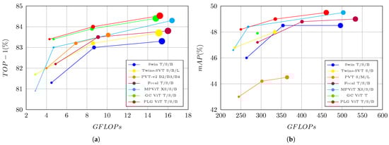 Comparison of PLG-ViT in terms of accuracy and efficiency with state-of-the-art methods [12,13,15,16,17,19,20] on the benchmarks ImageNet [21] and COCO [22]. Each method is represented by a circle whose diameter is proportional to the number of parameters. Our PLG-ViT outperforms comparable methods in terms of accuracy with similar numbers of FLOPs and parameters on both benchmarks. (a) Classification on ImageNet [21]. (b) Object Detection on COCO [22].