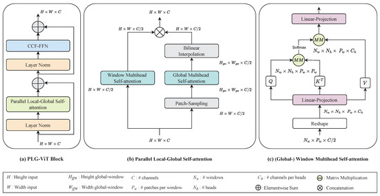 As mentioned earlier, PLG blocks for parallel local-global self-attention (PLG-SA) are the core element of our model and are presented in Figure 3a. The structure was inspired by the original transformer-encoder block [7,8], but we replaced standard multihead self-attention with a parallel local-global self-attention operation. This allows the global analysis of the image complemented by a local view. Furthermore, our CCF feed-forward network (CCF-FFN) replaces the linear MLP of the original transformer for further improvements in accuracy (see Section 4.4). Before self-attention and CCF-FFN, layer normalization [34] is performed. The i-th PLG block can be described by