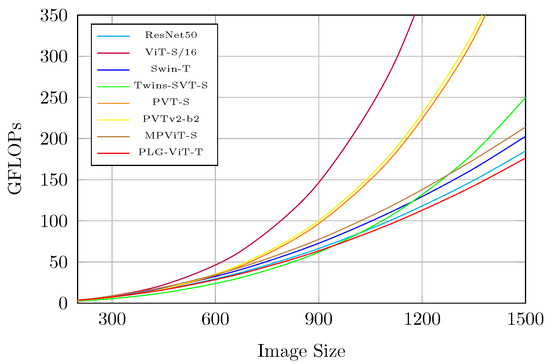 Complexity evaluation (GFLOPs) under different input sizes. The growth rate of GFLOPs: ViT-S/16 [14] > PVTv2-b2 [19] > PVT-S [13] > Twins-SVT-S [16] > MPViT-S [20] > Swin-T [12] > ResNet50 [1] > PLG-ViT-T (ours). All values are based on reproduced results.