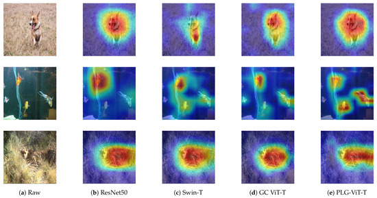 We used GradCAM [61] for the visualization of the final features. It generates heatmaps of an input image that highlight the regions of the image that are most important for the prediction. Figure 6 shows ImageNet-1K [21] val images and the final activation of ResNet50 [1], Swin-T [12], GC ViT-T [17], and our PLG-ViT-T. The GradCAM maps demonstrate the accurate object localization of our proposed method with the most intricate details. In particular, if multiple objects of the same class are present in the image, they are considered equally in the final prediction.