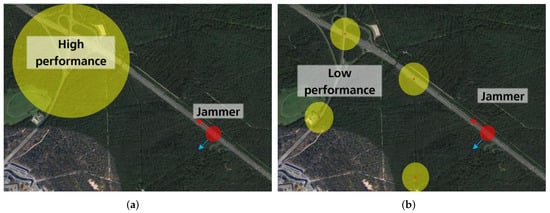 Interference signals are a significant problem for global navigation satellite system (GNSS) receivers [1]. Ideally, the signal sources should be located and removed to ensure the reliable operation of GNSS services. However, many interference signals have only a limited local effect and are difficult to detect without monitoring the infrastructure. In addition, the probability of intercept (POI) decreases significantly if the monitors are too sparsely distributed, making it almost impossible to detect, locate, and eliminate sources of interference. Conversely, too many monitoring stations increase the setup, calibration, and maintenance costs. Therefore, a geographic trade-off for interference monitoring networks exists. Figure 1 illustrates that the symbolic coverage of a single high-performance monitoring receiver is insufficient for detecting the jammer (interference source), but a network of low-performance monitoring receivers is also insufficient. It emphasizes that the ideal system has high-performance monitoring (i.e., large coverage per receiver) and a dense network of receivers to maximize the POI.