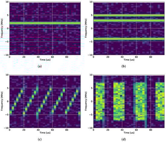 Classification example of different waveform types, showing the spectrograms. Yellow is high power and blue is low power, the signals are: (a) Single-tone, (b) Multitone, (c) Chirp, and (d) Pulsed noise.