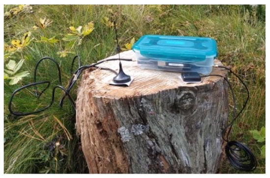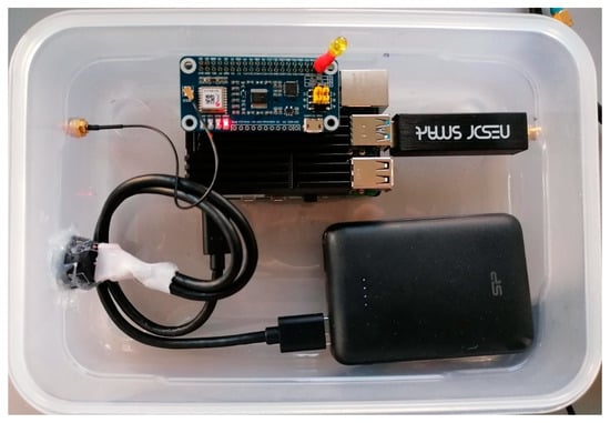 The second sensor is a NeSDR SMArt v4 (Nooelec, Wheatfield, NY, USA) that connects over USB 2.0 and contains an RTL2832U digital video broadcasting (DVB) radio-frequency front-end (RFFE). This sensor is reconfigured as a SDR RFFE and delivers 8-bit complex I/Q samples at a maximum sample rate of 3.2 MHz. It is sufficient to receive narrow-band GNSS signals, such as GPS L1 C/A (1.023 MHz chipping rate), but insufficient to accurately process and localize most GNSS signals. Nevertheless, the bandwidth suffices for detection, monitoring, and classification purposes. The received samples are further processed on the SBC. The GNSS pHat and the NeSDR receivers are supplied with antennas. Hence, no additional antennas are required. The GNSS antenna is a standard low-cost right-hand 24 circular polarized (RHCP) patch antenna with an integrated low-noise amplifier (LNA) and a main lobe towards the sky (zenith). The NeSDR uses a vertically polarized quarter-wave mono-pole antenna (whip antenna). The antenna has a null towards the sky and a main lobe towards the horizon, optimizing for terrestrial interference signals. Figure 4 shows the system outside in the Tupperware enclosure and with the antennas.