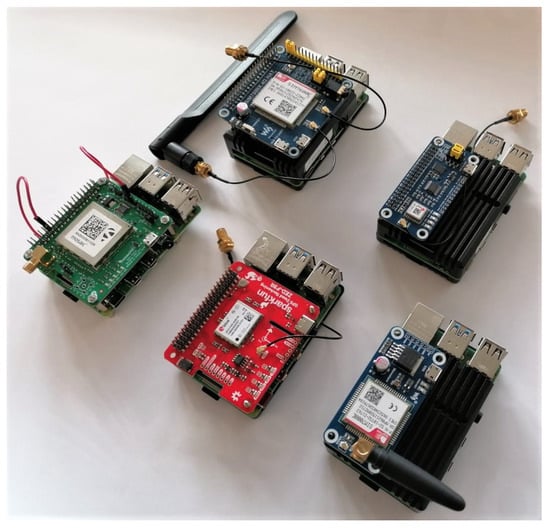 Many GNSS pHats could be used, as described in the previous section. Many of these provide superior performance (especially when multi-band GNSS is used), but are more expensive. Therefore, a cost-to-performance trade-off exists. Other pHats also combine GNSS reception with mobile communications, such as LTE. Figure 6 shows several pHats used for different prototyping approaches in the monitoring station.