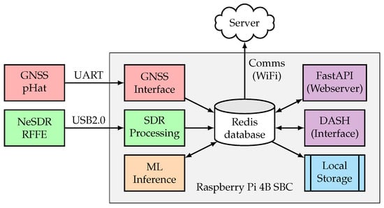 The software architecture changed from an integrated system to multiple micro-services connected via persistent storage to allow modularity, expandability, and robustness. All the components are connected to a Redis data structure server, where data are stored for logging or configuration purposes. The updated structure in Figure 7 consists of six major modules: the GNSS receiver interface and data extraction (red), the NeSDR RFFE receiver interface and SDR pre-processing (green), the ML detection model (orange), the data logging and uploading infrastructure (blue), the web application programming interface (API) and interface (purple), and in the Redis database that binds all the components (white). All the modules were implemented in Python 3.8 and executed as services with “systemd”.