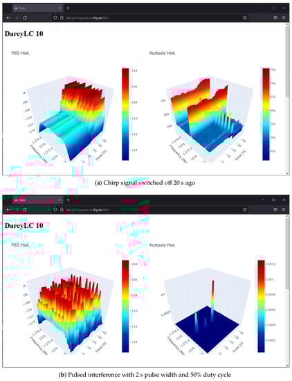 Screenshot of the web server front end, with interference visualizations of the spectral power and spectral kurtosis. The real-time measurements are done in a controlled laboratory.