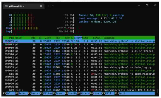 In addition to the main modules, system utilization is recorded for device health monitoring and automatic restarts in case of failures. An example system utilization with all processing enabled is shown in Figure 9. On average, the internal system health monitoring measured a CPU utilization of 31.8% and 645 MB of random access memory (RAM). It indicates that the Raspberry Pi is can handle the whole system without issue.