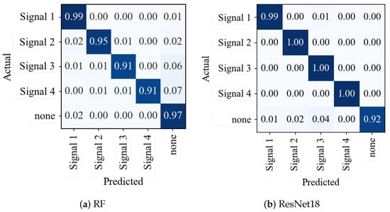 Classification is a significantly more complex problem than detection. The traditional approach is to create several purposefully built detectors (i.e., several metrics based on Equation (3)) for each class of signal considered and maximize the correct decision thresholds to distinguish between them [17]. For example, it can be done by using a multiple-hypothesis generalized likelihood ratio test (GLRT). However, it requires significant resources and could be more practical. Hence, a detector tree structure is often deployed to simplify classification. Pre-processing the signal often supports the classification engines. Typical inputs for classification are the spectrogram of the received signal, amplitude statistics, and the signal PSD.