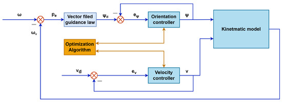 The architecture of the IPSO-SM controller is shown in Figure 2. The desired trajectory and velocity are used as input in the model. With the help of the expanded vector field guidance method, a set of desired yaw angles will be generated from the input trajectory. The orientation and velocity controller will output the optimal yaw angle and velocity according to the current angle error and velocity error, respectively, under the optimization of IPSO. Then, after the calculation of the vehicle kinematic model, the current position of the vehicle will be the output.