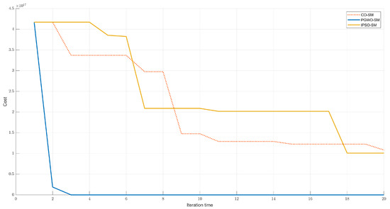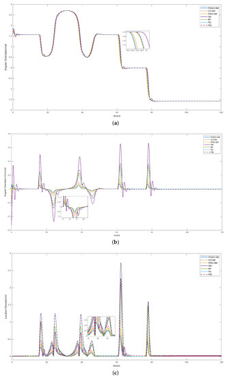 The test scenario is a complicated trajectory. We set the velocity of the controlled vehicle to 20 m/s. We compared the proposed method with other widely used algorithms such as cuckoo search optimization-based Sliding mode control (CO-SM), sliding mode control (SM), backstepping control (BP), PD control, and PID control. The trajectory tracking result is shown in Figure 3. The cost function value of different evolutionary algorithms is shown in Figure 4. Figure 5a–c demonstrates the angular orientation error and the location deviation.
