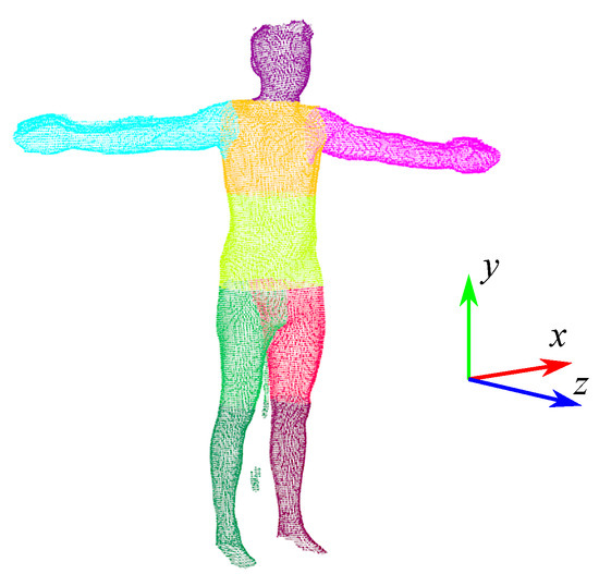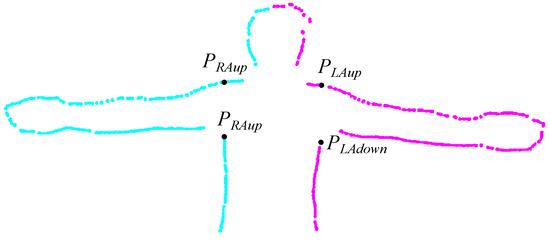 In order to determine somatic parameters from a 3D scan (point cloud), it is necessary to perform segmentation in order to separate individual body segments. The 3D scan of the human figure is divided into 9 parts (Figure 3): head, upper torso, lower torso, right arm, left arm, right thigh, left thigh, right lower leg, and left lower leg. Segmentation is based on the proportions of individual parts of the body and finding the characteristic features of the human figure. The necessary aspect ratios for individual parts of the body were determined on the basis of measurements carried out on the test group. In the segmentation process, the location of the scan in the coordinate system is important (see Figure 3). To perform the calculations correctly, the scan should be positioned so that the z-axis corresponds to the sagittal axis of the human body, the y-axis corresponds to the vertical axis, and the x-axis corresponds to the transversal axis. First, the geometric center of the point cloud is calculated, which determines the approximate position of the scanned character’s hips. Then the point cloud is filtered so that only points belonging to the hips remain. Among these points, the point () with the smallest value of the z coordinate is searched. The y coordinate of the point corresponds to the height for which the hip circumference (HC) is calculated. This height also defines the dividing line for the lower and upper body parts so that the scan can be divided into two parts corresponding to the humans’ upper and lower body. Then, for the points whose value for the y-axis is in the range (), the algorithm determines points with the smallest () and largest () value of the x coordinate. The x coordinates of these points allow us to calculate , and then determine the points that belong to the right (points with the value of the coordinate x less than ) and left (points with the coordinate value x greater than ) side of the scanned human. Then, based on the proportions of the body, for the right lower part of the body (right leg) and the left lower part of the body (left leg), the coordinates y of the scanned character’s knees are determined, which allows for determining the points belonging to the right thigh, right lower leg, left thigh, and left lower leg. In order to isolate the arms, the points corresponding to the upper body are projected onto the plane and processed by the Concave Hull method to determine the points that define the outline of the 2D projection of the upper body (see Figure 4). Then, the contour points obtained in this way are filtered to isolate the points belonging to the right (points with the coordinate value x less than ) and the left (points with the coordinate value x greater than ) part of the human figure. In the next step, an analysis is performed to determine the points defining the beginning of the right ( and in Figure 4) and left ( and in Figure 4) of the arm. First, points and are determined, which define the lower beginning of the arms. These points are determined on the basis of the analysis of the directions of normalized vectors, the beginning, and end of which are determined by successive contour points. is defined as the origin of the first normalized vector for which the x coordinate is greater than the parameter, with the assumption that the analysis proceeds from the lowest points. Having , subsequent points are analyzed in order to find a point () whose coordinate x is close to the x coordinate of the point . Determination of and is performed in a similar way, except that the points belonging to the outline of the left side of the human are analyzed. With the points , , and the points belonging to the torso, right arm, left arm, and head can be determined. The torso is then split in half to make an upper and lower torso (Figure 3). The calculations were carried out using the PCL library [46].