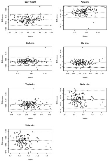 Analysis using the Bland–Altman method (Table 2) showed that as many as five parameters had a recurrence rate of less than . For calf girth, a was recorded, while the highest for arm girth was . The best precision is characterized by the estimation of the body height parameter . The coefficient of repeatability was very small and its value was equal to 0.04 for four parameters (body height, calf girth, hip girth, and thigh girth) and 0.06 for three parameters (arm span, arm girth, and waist girth).