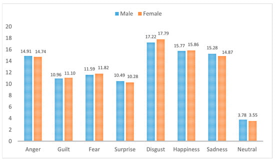 Percentual distribution of each emotion with respect to the global number of instances for male (blue) and female (orange) speakers.