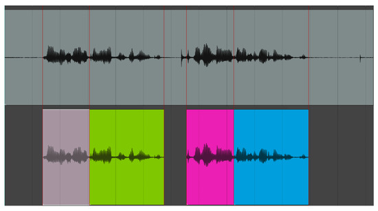 Example of segmentation starting from the original signal (above, in grey). The segments are defined manually, according to prosody and syntax, and may contain full words or parts. Silence at the beginning and end, long pauses and eventual noises are all removed. The individual segments, divided on the time points defined by the red lines, are found below (each is differently colored).