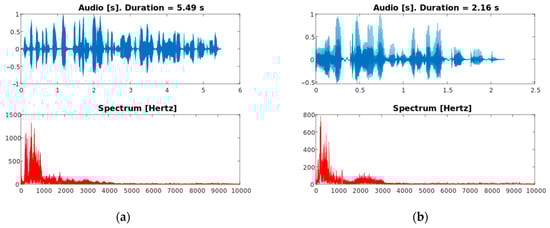 (a) Example audio segment from a female speaker, with emotion “neutral”; (b) Example audio segment from a male speaker, with emotion “guilt”.