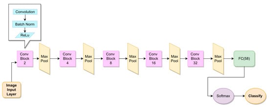 Several CNN architectures were experimented using either spectrograms or MFCC-graphs as image inputs. Besides custom ones, common pre-trained nets were also employed with the aid of transfer learning, namely GoogleNet [22] and AlexNet [23] pre-trained on the ImageNet dataset. The results only report those that brought significant results, which are the AlexNet and our custom architecture, which will be referred to as “CNN1” and that we built with the aim to be less deep without sacrificing accuracy. CNN1 consists of five convolutional layers of increasing number of filters, from 2 to 32. Each convolutional layer is followed by a batch normalization layer, a ReLu activation function and a max-pooling layer. A fully connected layer of 58 neurons, one per speaker, flattens the convolutional output and brings to the classification which is rendered by a softmax layer followed by a simple decision layer. The CNN1 architecture is detailed in Figure 5.