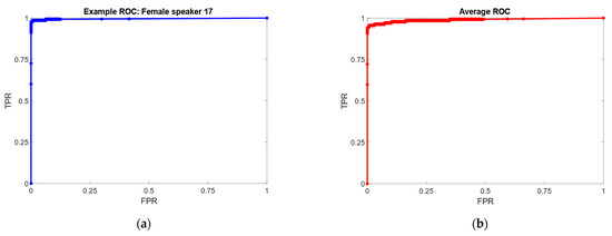 (a) Example ROC curve, by female speaker. AUC = 0.991; (b) Average ROC curve computed by macroscopically averaging FPR and TPR values for each one-vs-all comparison. Average AUC is 0.985. FPR (x-axis) = False Positive Rate (or 1–Specificity), TPR (y-axis) = True Positive Rate (Sensitivity).